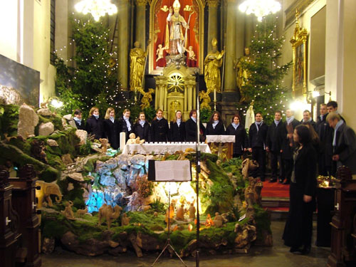 V božičnem času smo pripravili kar tri koncerte v sodelovanju s sopranistkama Tejo Saksida in Matejo Praprotnik, ter organistom in skladateljem Gašperjem Jerebom. Program koncerta je bil zasnovan kronološko, tako smo prepevali vse od gregorjanskega korala do sodobne glasbe. Prav za ta koncert je naš skladatelj priredil Gruberjevo Sveto noč za sopran, klavir in zbor. Pri svojem skladanju se je naslonil na ime zbora, tako skladba zveni zelo skrivnostno.