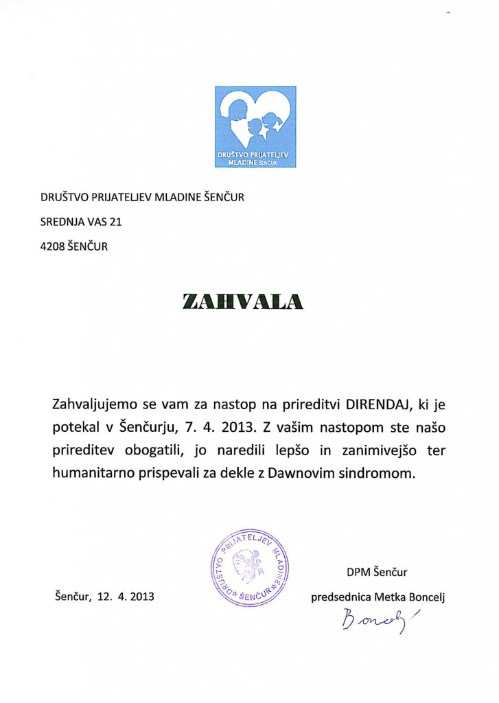 Z velikim veseljem smo se pevci in pevke odzvali prijaznemu povabilu in s svojim petjem obogatili zabavno prireditev Direndaj, ki je potekala v nedeljo, 7. aprila, v športni dvorani v Šenčurju. Direndaj je organiziralo Društvo prijateljev mladine Šenčur (DPM) ob 40-letnici delovanja organiziralo ter s prireditvijo obeležilo tudi 60-letnico delovanja Zveze društev prijateljev mladine Slovenije. Prireditev je imela tudi dobrodelno noto, saj so zbirali denar za deklico s posebnimi potrebami. Radi se udeležujemo dobrodelnih koncertov in tako s svojim talentom pomagamo drugim pri doseganju svojih ciljev.