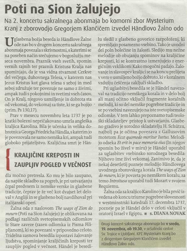 Uglasbena božja beseda iz Händlove Žalne ode nas bo v drugem koncertu sakralnega abonmaja povezala s skrivnostmi, s katerimi se na poseben način srečujemo v bogoslužju meseca novembra. Praznik vseh svetih, spomin vernih rajnih ter praznik Kristusa Kralja nas spominjajo, da je vsa vidna stvarnost Cerkve del večjega, duhovnega Telesa, v katerem nas Jezus Kristus kot glava telesa s seboj in med seboj združuje ter povezuje ne samo z živimim ampak tudi s pokojnimi in svetimi vseh časov…