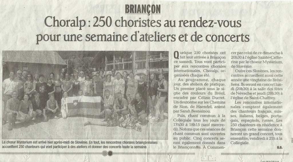 V tednu med 20. in 27. julijem se je KPZ Mysterium Kranj na povabilo organizatorjev Choralp Briançon kot demonstracijski zbor udeležil mednarodni pevski teden 2013 v najvišje ležečem francoskem mestu Briançon. Delavnice, ki je potekala vsakodnevno v dopoldanskem in popoldanskem času, so se udeležili zbori in posamezni pevci iz vsega sveta: Francije, Švice, Italije, Belgije, Španije, Portugalske, Rusije, Argentine in Brazilije. Delo je potekalo pod vodstvom priznanega gostujočega dirigenta Nestorja Zadoffa iz Argentine, ki deluje tudi kot skladatelj, dirigent ter predavatelj na inštitutu v Buenos Airesu in na nacionalni Univerzi v Rosariu, Argentini. Približno stočlanski zbor je na pevskih vajah z dirigentom pripravlil mogočno in obsežno delo G. F. Haendla The ways of Zion do mourn za zbor in godalni orkester, ki je bilo napisano za pogrebno slovesnost kraljice Karoline. Predstavili so ga na zaključnem koncertu v cerkvi Notre Dame v Briançonu ob spremljavi baročnega godalnega orkestra iz Italije. Solistične dele so odpeli mladi nadarjeni pevci kranjskega zbora Eva Čeh, Ajda Valher, Erik Šmid in Filip Kralj, učenci solopetja GŠ Kranj iz razreda prof. Francke Šenk in prof. Janeza Hostnika. KPZ Mysterium Kranj z zborovodkinjo Urško Štampe, ki se je za delavnico pripravil že vnaprej, se je predstavil tudi z dvema samostojnima koncerta v Brainconu in bližnjem mestu Vallouise. Čeprav je bil teden pevsko zelo naporen, so se pevci navdušeni vrnili z bogatimi in nepozabnimi izkušnjami. Vestno delo in uspešni koncerti so bili tako lepo nagrajeni.
