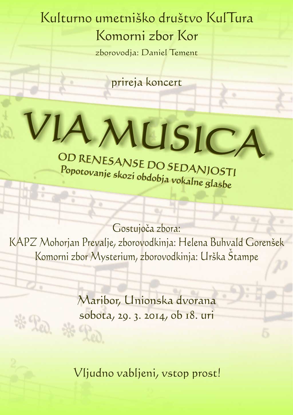 Kulturno umetniško društvo Kultura je v soboto, 29. marca, pripravilo koncert pod naslovom Via musica – od renesanse do sedanjosti. Na skupnem koncertu so se predstavili trije zbori. Poleg našega še Komorni zbor Krog iz Ptuja pod vodstvom zborovodje Daniela Tementa in Komorni akademski pevski zbor Mohorjan iz Prevalj pod vodstvom zborovodkinje Helene Buhvald Gorenšek. Na popotovanju skozi obdobja vokalne glasbe so poslušalce popeljali z raznolikimi in skrbno izbranemi programi, saj so se vsi trije zbori aprila potegovali na državnem zborovskem tekmovanju Naša pesem.